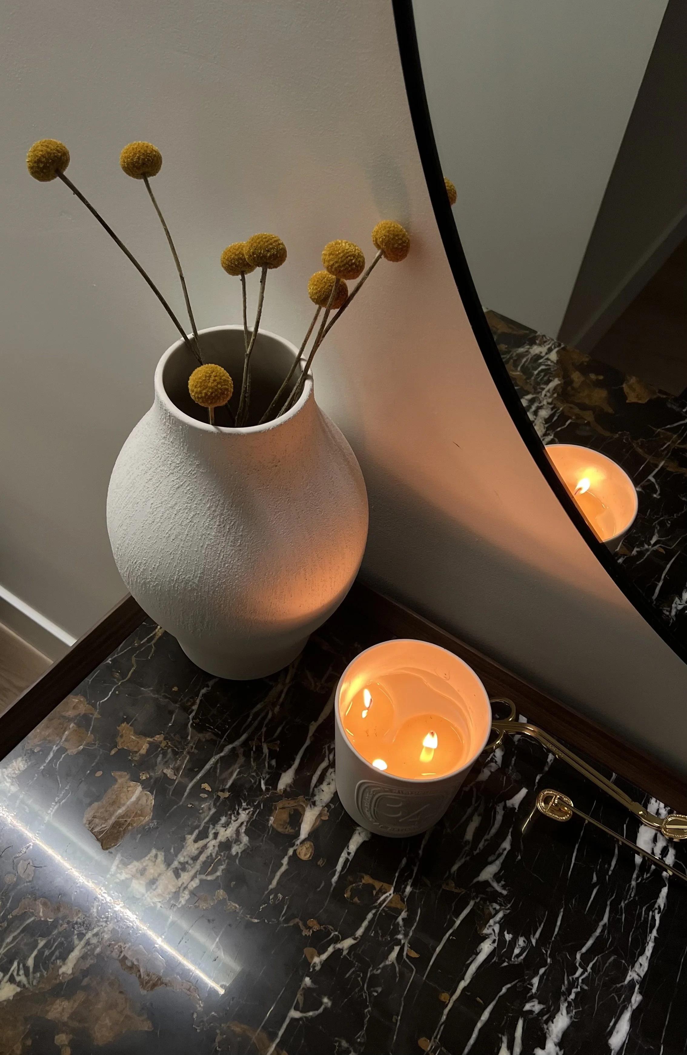 “Estoy en pleno proceso de decoración de una casa que he comprado recientemente. Tras 4 meses de obras, lo primero que hice, fue decorar con la vela del 34 de Diptyque el primer mueble que recibí. Se trata de una cómoda de madera de nogal y mármol que ahora mismo es protagonista del recibidor.